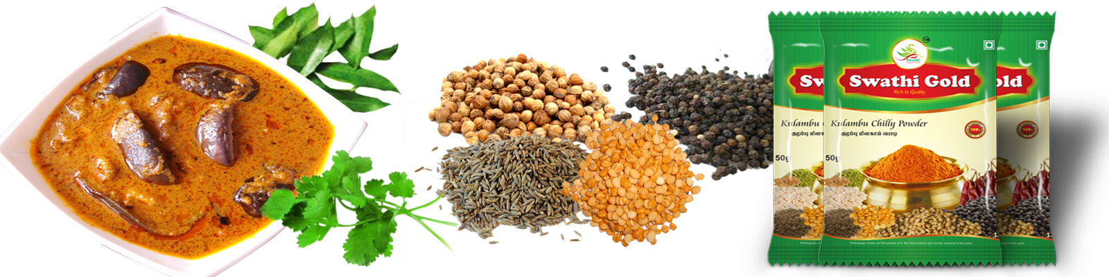 SWATHI Foods brings to you a flavourful blend of spices, Kulambu powders & Bajji-Bonda Mix powders, certified by AGMARK for its consistent and superior quality. Available in wholesale & retail outlets across Puducherry, SWATHI Foods also exports its spice products to other countries.